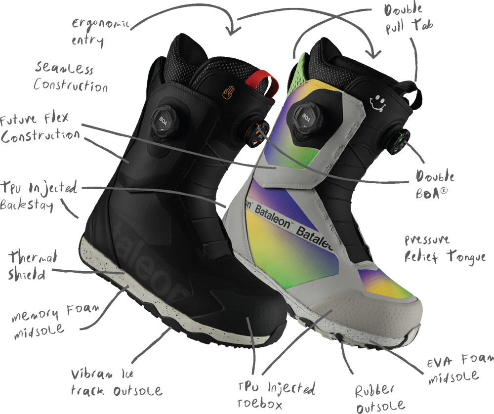 Liberate your riding with the lightweight design of Bataleon boots. We know every ounce matters when you're flying down the slopes, and that's why we've meticulously crafted boots that offer both lightweight comfort and uncompromising performance. With trusted partners like Vibram® for unparalleled traction, Boa® for a precision fit, and Thinsulate® for optimal warmth, you're equipped to excel in any environment. The carefully crafted cushioning enhances your ride, providing the support you need without sacrificing responsiveness.